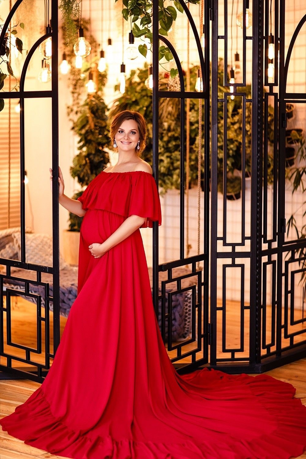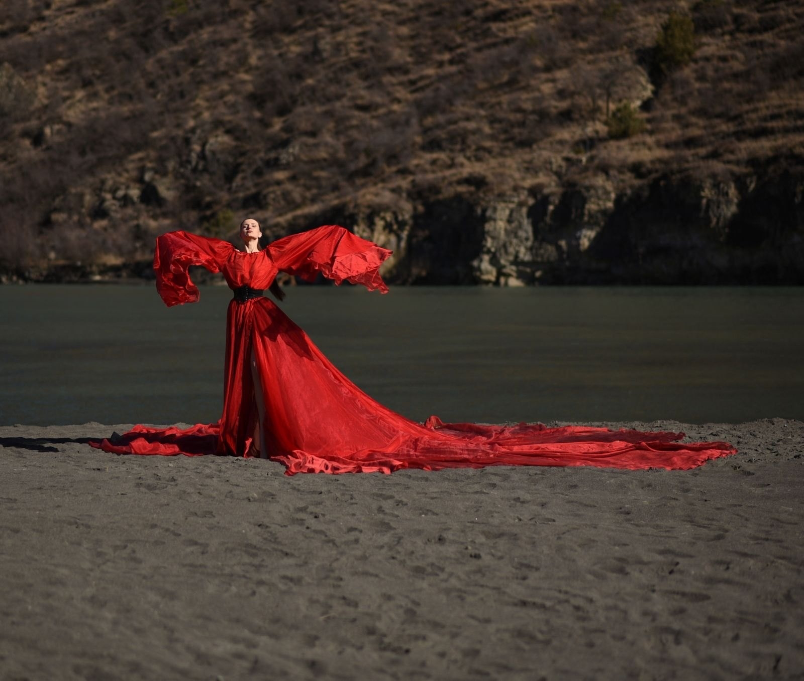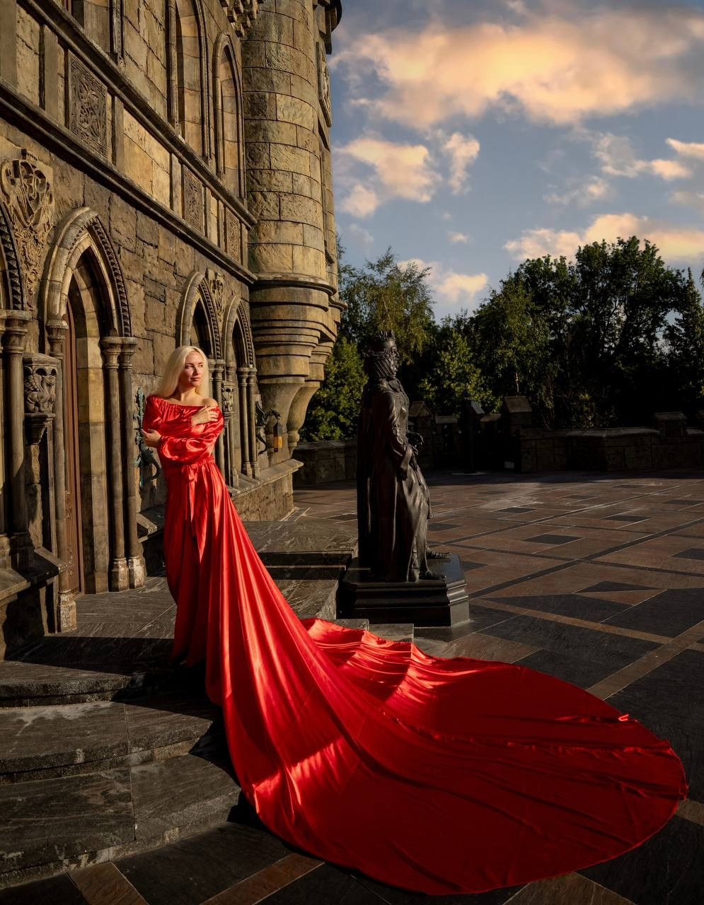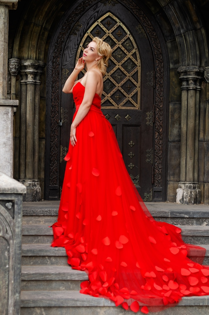 Красное платье с широкими рукавами и шлейфом