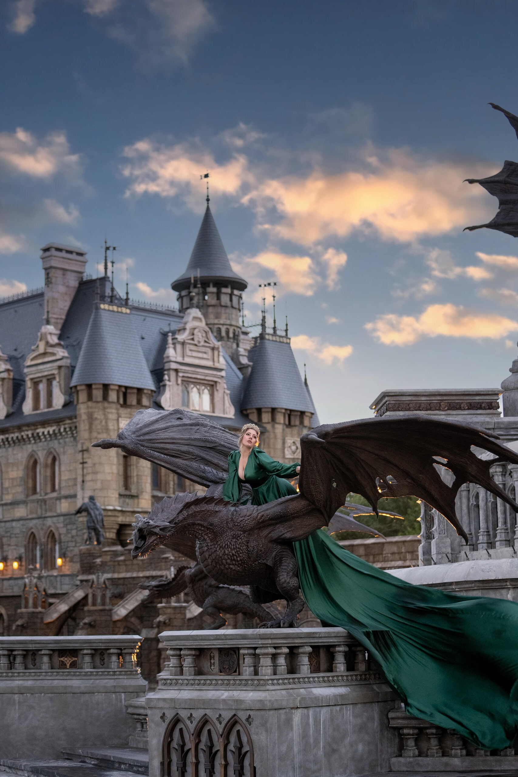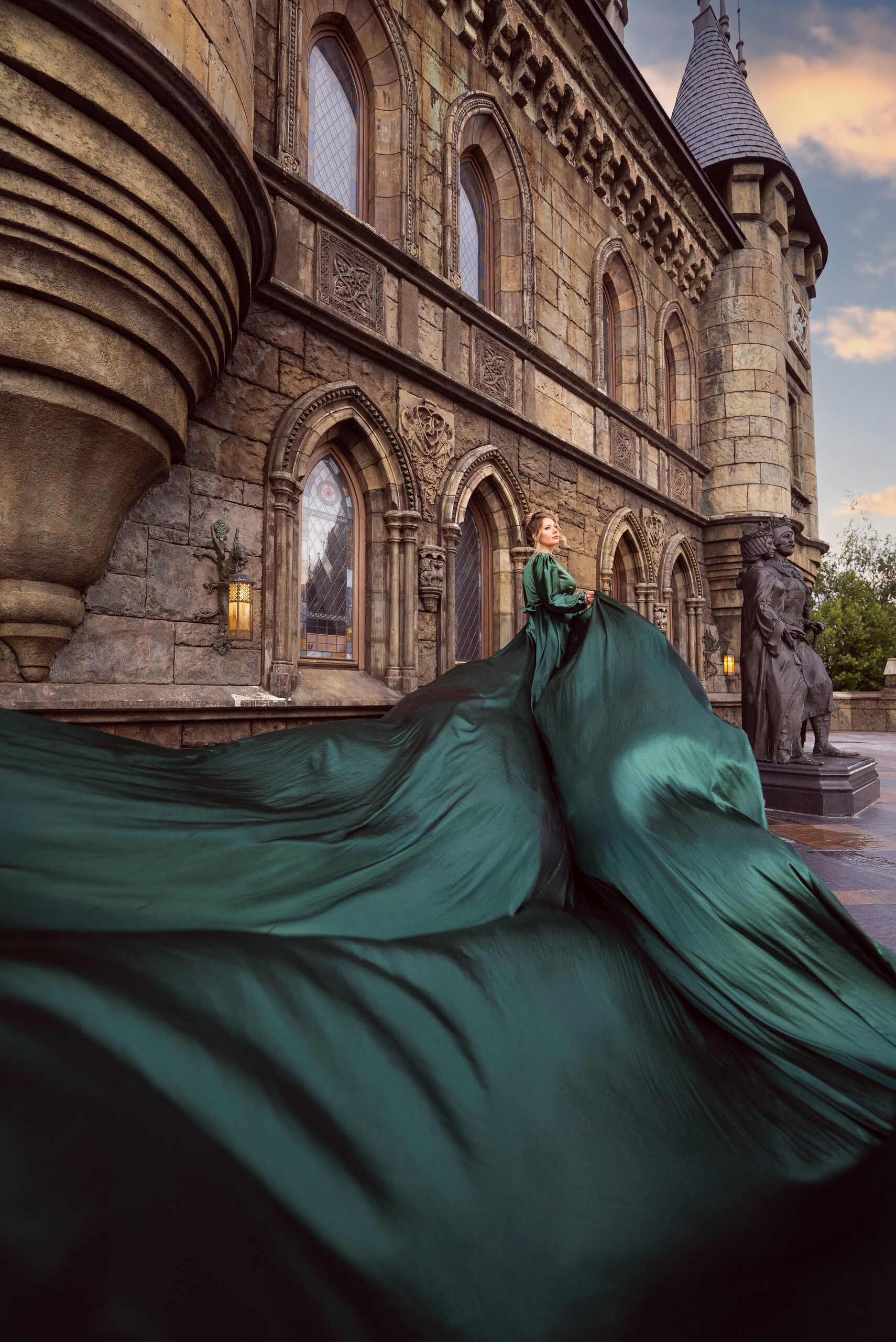 Платье изумрудное с трёхметровым шлейфом