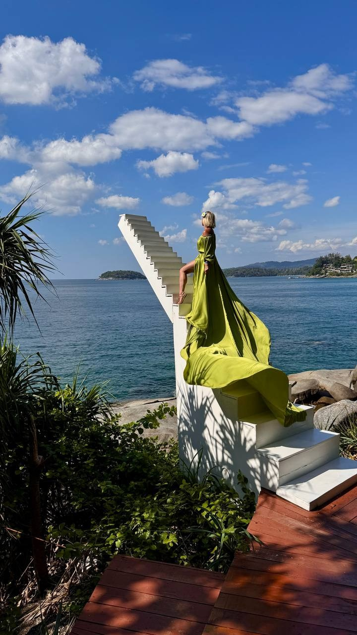 Платье с длинным шлейфом в травяном цвете